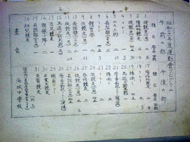 この取材中、昭和21年の文化祭は11月1日、2日と2日間行われたはずで、とりわけムーラン公演は「芸能祭」の最後に行われたはず、と何人かの方々よりご証言を頂きました。これはしたり、と資料室で再度調査すると、なるほど1日目は体育祭(写真2)が、2日目が演劇会部による「ベニスの商人」公演をはじめとする「芸能祭」が行われた(写真3、4)ことが分かりました。従いまして、ムーラン海城公演は「昭和21年11月2日」と訂正させて頂きます。