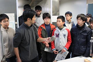 午前中は,京都大学を訪れました。原発反対をはじめ多くの看板が掲げられ,大学の雰囲気を感じることができました。大学では,京都大学大学院 人間・環境学研究科の石川尚人教授にご協力いただき,先生の研究紹介を聴き,実験室を見学させていただきました。岩石の磁性を測る簡単な実験をしたり,38億年という年代測定値を持つナピア岩体の岩石を触らせてもらったりと,とても有意義な時間を過ごしました。午後は,一気に琵琶湖の湖西地方に移動。雪をかぶった比良山系の山並みが美しい滋賀県高島市の針江を訪れました。ここでは,比良山系で浸みこんだ地下水が湧き出し,その水が人々の暮らしを豊かにしています。湧水を「生水(しょうず)」と呼び大切にする暮らしぶりを,「針江生水の郷委員会」の方々の案内で見学させてもらいました。日本ではあまり取り上げられませんが,地球規模の水不足が懸念されています。その中で水を大切にする暮らしぶりは,我々も見習わなければならないと感じました。滋賀県長浜市に宿泊。