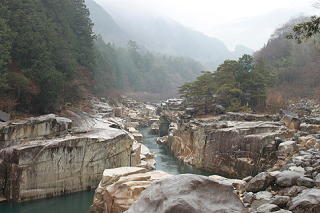 雨でガスがかかり,また違った雰囲気でした。花こう岩を木曽川が削り込んだ地形です。