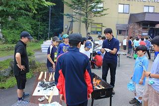 本日はのんびりのんびり蓮池周辺を散策してお腹がすくのを待った後、ホテル前でバーベキューを行いました。いっしょに岩菅山登山をした先生方にアドバイスをいただきながら火をおこし、バーベキューを存分に楽しみました。