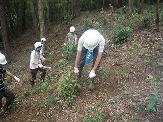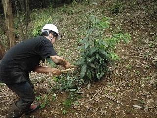 続いて、北野の谷戸にある林の管理作業を行いました。この林は、落ち葉を集め、畑や田んぼで使用する肥料を作るための落葉広葉樹の林(雑木林)にするように管理しています。現在では、常緑樹であるシラカシが増え、落葉広葉樹から常緑樹に遷移しつつあるので、シラカシなどの常緑樹の伐採を行っています。今回の作業では、昨年伐採したシラカシの切株からでてきた「萌芽」を枝切りばさみや鎌で切る作業や直径2cm程度の低木をノコギリで伐る作業を行いました。斜面での作業で大変でしたが、黙々と作業をこなしていました。