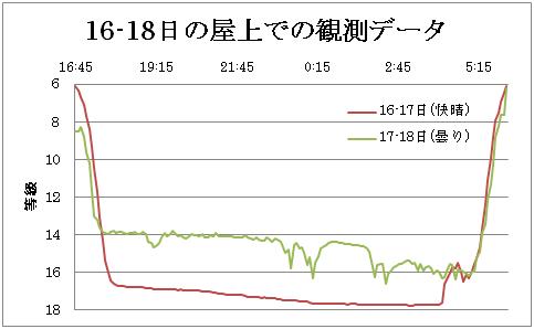 16−17日の17日に入ってからの4:00頃に急激に明るくなっているが、これは雲が出てきたため。よって最後の経時変化(時間による数値の変動のこと)が一致している。これは天気が同じ日は経時変化が一致することが確認できる。それとは反対に16:45〜の経時変化は快晴であるため、経時変化が異なっている。雲がない日(赤のグラフ)は数値が低い(明るい)がこれは太陽光が直接来るからで雲がある日(緑のグラフ)は数値が高い(暗い)がこれは雲によって太陽光が遮られるからである。