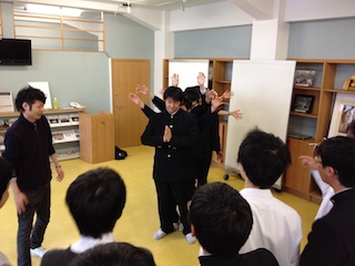 その後、簡単な創作活動を行いました。部屋の中をスペースが均等になるように歩き回り、告げられた人数で集まり、出されたお題にあわせて場面を創ります。