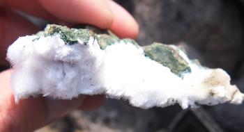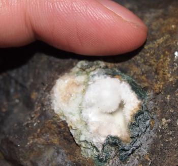このような形で、青緑色のセラドン石という雲母グループの鉱物のまわりを掘っていくと、輝沸石やモルデン沸石などが見つかります