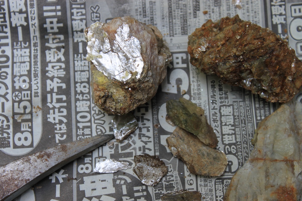 よく鉱物の結晶が成長しており,銀色に光っているのは白雲母です.運動場でも手にくっつく小さなキラキラした鉱物ですが,ここのものはそれが大きく成長しています.太陽光のもとではキラキラときれいで,私も学生時代にここで出会い感動しました.同じような感動を生徒と共有でき懐かしいです.