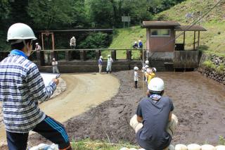 研究所前の白坂量水堰です。山地の森林から流れてきた土砂は、ここの堰で堰き止められます。そして、その土砂はここに溜まっていきます。この量を測りました。ここでは流量も測定されています.