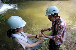 3日目は,生態水文学研究所のある演習林で、一日、森林水文学に関する調査を行いました。朝から雨が強く降り心配しましたが、何とか午前中のうちに止み、少し計画は縮小となりましたが、十分な実習することができました。具体的には、森林からの土砂の流出量の測定です。この調査は、森林伐採ではげ山になってしまった頃から,80年くらい継続されてきたもので,森林の回復とともにどのように土砂の流出量が変化してきたかを捉えている学術的にも珍しく貴重なデータです.今回は、その貴重なデータの測定にかかわらせてもらったのです。測量をしてから,土砂と川に流していく「砂出し」という作業を行い,また測量をして土砂の量を測定します.「砂出し」はかなりハードで、いくつかの種類の道具で,数時間,ひたすら砂を水の流れに乗せるようにして崩していくという,しんどいものでした。最終的に,測量の結果を算出してみると,我々とスタッフの方々で合わせて32m3の土砂をかき出しました.でも、教室では見られないような笑顔とまなざしを見ることができ、たくましく感じました。少々マニアックではありますが、この貴重な調査に関わることができ、皆さんにとっては、充実した爽やかな汗を流したのではないでしょうか。