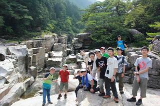 川原に転がる大きなレキと思われる岩をバックに記念写真。自然の偉大さがわかります。教科書や資料集の写真では実感できない本物を見る醍醐味がここにあります。