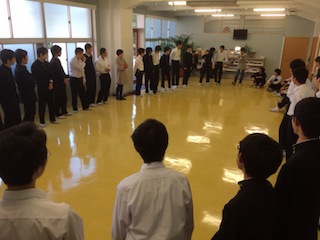 まずはじめに、大縄跳びを行いました。ただ教室の両端で縄を回すふりをしている人はいますが、実際に縄はありません。生徒たちは見えない縄を飛んでいきます。