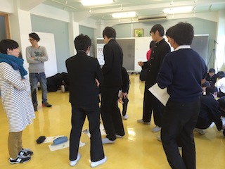 授業の後半では、修学旅行先で撮ってきた写真を使って、班ごとに演劇の作品を創っていきました。このクラスには、あらかじめ旅行の前に、班員全員で何かの場面を演じているような写真を撮ってくるという課題が出ていました。授業ではそうして京都や大阪などで撮ってきた写真の1分前から1分後までの物語を創ります。実際にその前後にあった出来事を再現するのではなくて、その写真から発想して自由に物語を創っていきます。