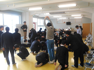 授業の前半では、ウォーミングアップとして体を使ったゲームを行いました。出されたお題に合わせて、ものの形を創ります。