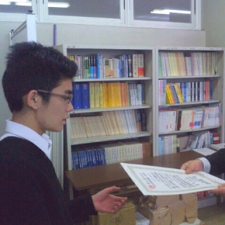 そのなかで、高校生部門の賞は約10個用意されており、その審査もまず各地域(ブロック)で選考して当落を決定した後,中央審査を経て,受賞作品を決定するという厳正さでした。今回は、高校生部門は合計13作品に賞が与えられ、その中の2作品で、本校高2年の山口哲君,井上立之君が奨励賞に輝きました。