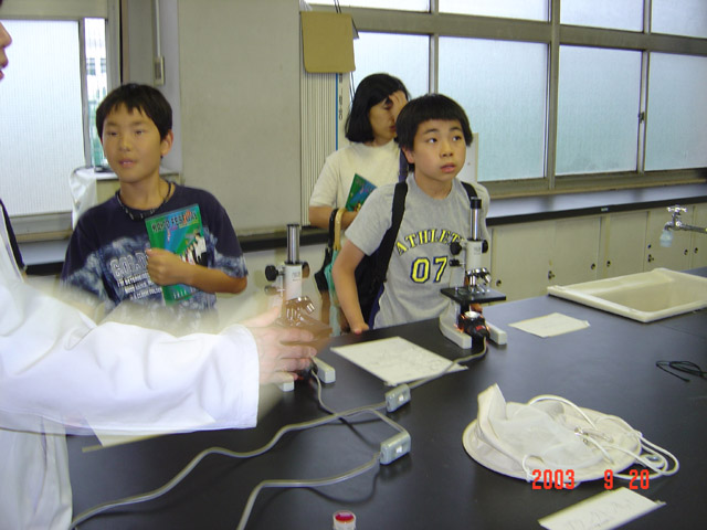 まず、中高生物部は、顕微鏡を展示室に持ち出し、生きているプランクトンの観察ができるようになっていました。来室した小学生がレンズ下で動き回るプランクトンに見入っていました。またプラナリアや、カエル、多くの海生動物などを生物飼育室で長年飼育を続けその一部も展示していました。海生動物水槽には、今の時期には飼育していませんがウニが飼育され、ウニの受精実験が全生徒の実験観察に供されています。変わったところでは、金魚すくいもあり小学生などの来室者に人気があったようです。