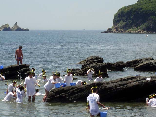 僕が一番思い出に残ったのは,磯観察です。生まれてはじめてシュノーケルを使って海に浮かびながら観察しました。ふぐや石鯛といった魚や,ウニやなまこといった棘皮動物を,じっくり観察することができました。網も持っていきましたが,残念ながらいっぴきも捕まえることはできませんでした。途中,銀色に光る数十匹の魚の群れを見つけました。今まで僕が見た魚の中で一番神秘的なものでした。この磯観察が終わった後,ウニの口に注射器で刺激を与えて卵を産ませるという実験をしました。生まれた卵は,最初1時間に1回ぐらいの割合で細胞分裂していました。また今度夏休み中に海に行くことがあるので,そのときにまた様々な生き物を観察したいです。